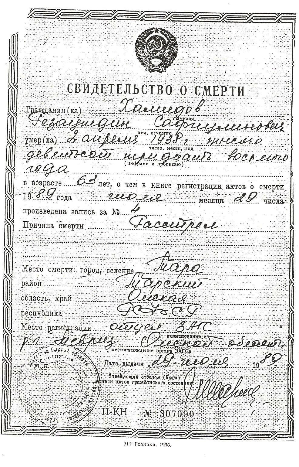 Свидетельство о смерти Ризаэтдина Хамидова