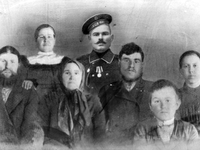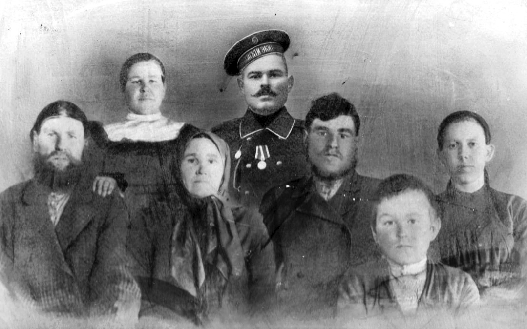 Илья Ефимович и Лукерья Андреевна Притужаловы (стоят) с семьёй мужа.