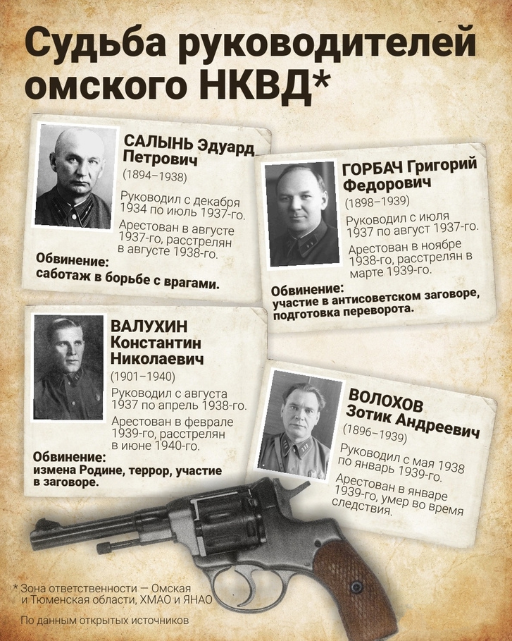 Все четыре начальника УНКВД Омской области, работавшие в 1937-м и 1938-м годах и руководившие репрессиями в Тюменской области, умрут. Все они почти ровесники, карьеру начинали молодыми чекистами сразу после революции. В годы террора последовательно выполняли свои задачи по уничтожению «врагов народа», а потом сами же были уничтожены как отработанные детали страшной машины. В будущем их признают преступниками, никого из них не реабилитируют.
