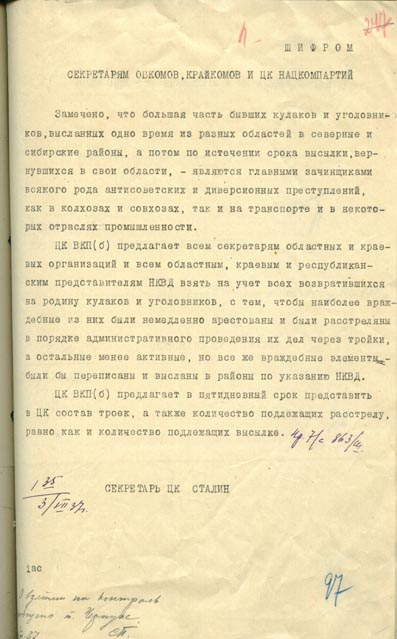 «Всем секретарям областных и краевых организаций и всем областным, краевым и республиканским представителям НКВД взять на учёт всех возвратившихся на родину кулаков и уголовников с тем, чтобы наиболее враждебные из них были немедленно арестованы и расстреляны в порядке административного проведения их дел через тройки, а остальные, менее активные, но всё же враждебные, элементы были бы переписаны и высланы: по указанию НКВД. В пятидневный срок представить в ЦК состав троек, а также количество подлежащих расстрелу, равно как и количество, подлежащих высылке. Секретарь ЦК И. Сталин».