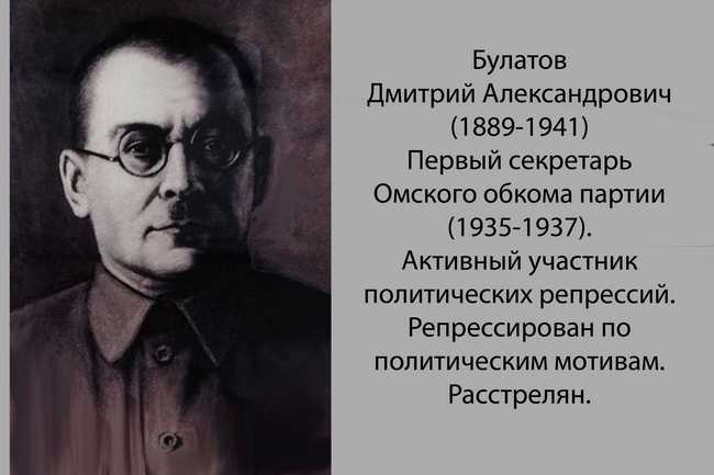 Первым секретарём обкома ВКП(б) был избран на партийной областной конференции Дмитрий Александрович Булатов. Это был уже зрелый, 45-летний человек, один из видных представителей партноменклатуры того времени. Родился в Тверской губернии в семье крестьянина. В РСДРП(б) вступил в 1912 году. В 1915 году за распространение листовок антивоенного и антиправительственного содержания был сослан в Туруханский край. Ссылку отбывал в селе Монастырском вместе со Свердловым и Сталиным. В 1919 году – заместитель председателя Тверского губисполкома. С 1924-го по 1931 год после окончания двухгодичных курсов марксизма-ленинизма работал секретарём Вятского губкома, завотделом Северо-Кавказского крайкома, секретарём Кубанского окружкома, завотделом ЦК ВКП(б). В 1931–34 годах возглавлял отдел кадров ОГПУ. С этой должности и был направлен в Омск, где проработал до октября 1937 года. Но был в его биографии один штрих, который вскоре ему припомнят. В Личном листке учёта кадров на вопрос об участии в оппозиции он, не скрывая, ответил, что «в 1918 году во время заключения Брестского мира поддерживал левых коммунистов. Допущенную ошибку быстро осознал и отошёл. В организационной связи с левыми коммунистами не был» (ЦДНИОО, ф.17, оп.26 д.14, л.3). Левые коммунисты и левые эсеры считали Брестский мир предательством идеи мировой революции и мирового пролетариата, в отличие от патриотов, считавших этот мир предательством России.