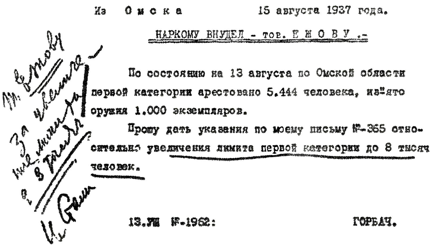 «Наркому Внудел тов. Ежову. По состоянию на 13 августа по Омской области арестовано 5444 человека. Прошу дать указание по моему письму N365 относительно увеличения лимита 1-й категории до 8 тысяч человек. Горбач.»