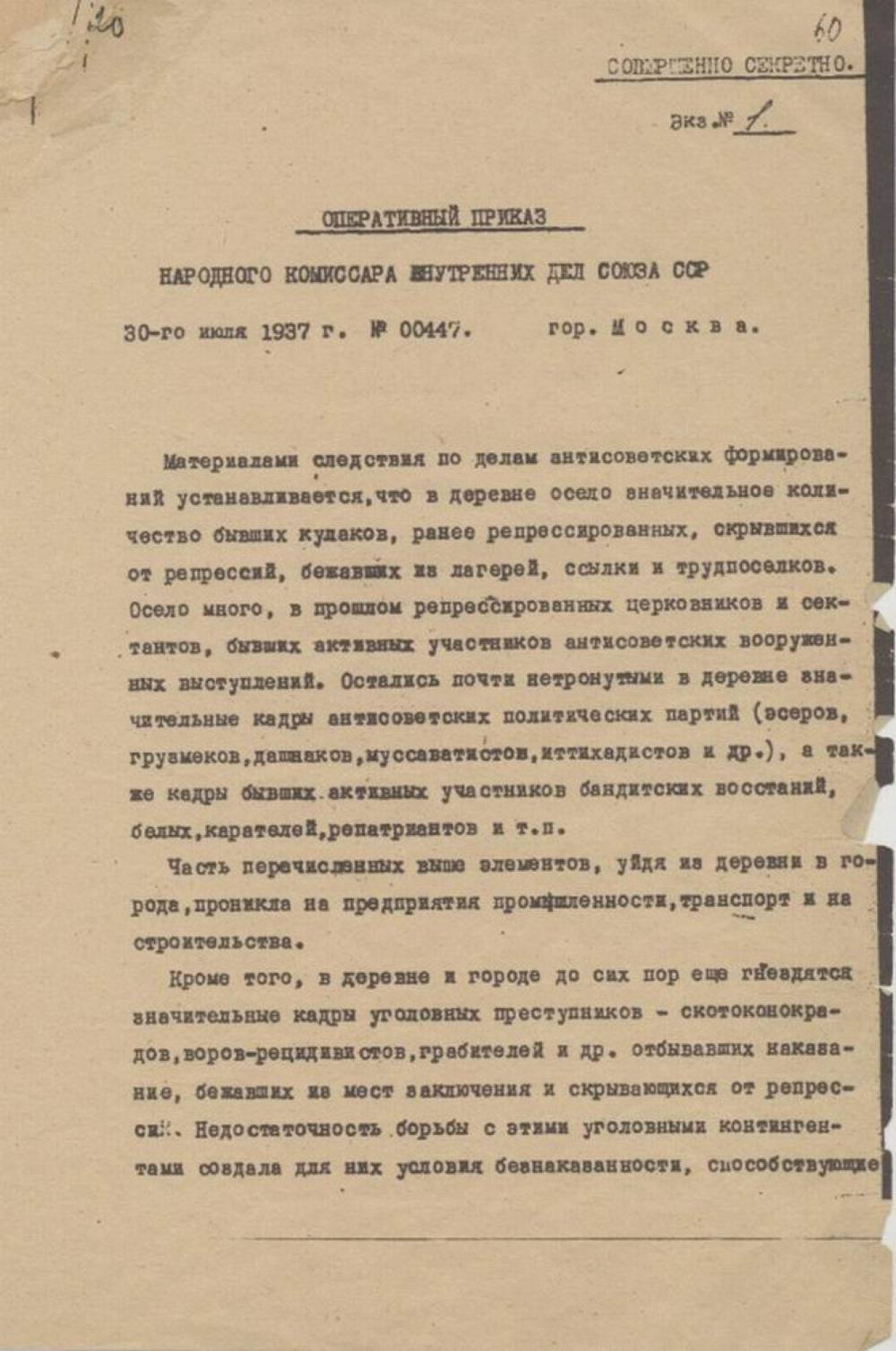 С 5 АВГУСТА 1937 ГОДА ВО ВСЕХ РЕСПУБЛИКАХ, КРАЯХ И ОБЛАСТЯХ НАЧАТЬ ОПЕРАЦИЮ ПО РЕПРЕССИРОВАНИЮ БЫВШИХ КУЛАКОВ, АКТИВНЫХ АНТИСОВЕТСКИХ ЭЛЕМЕНТОВ И УГОЛОВНИКОВ.