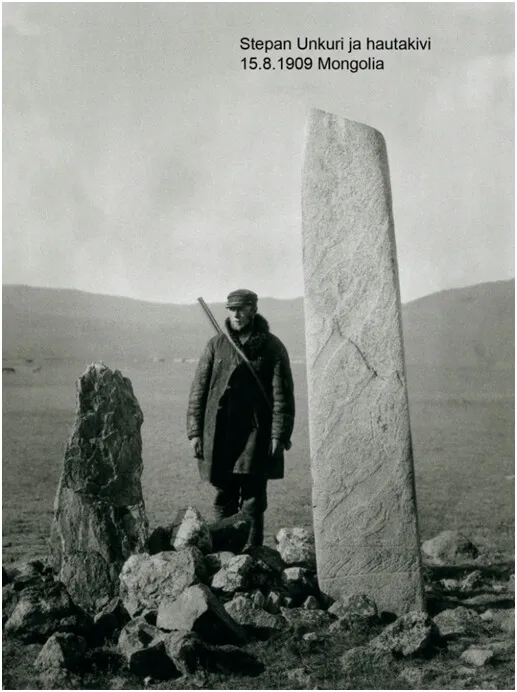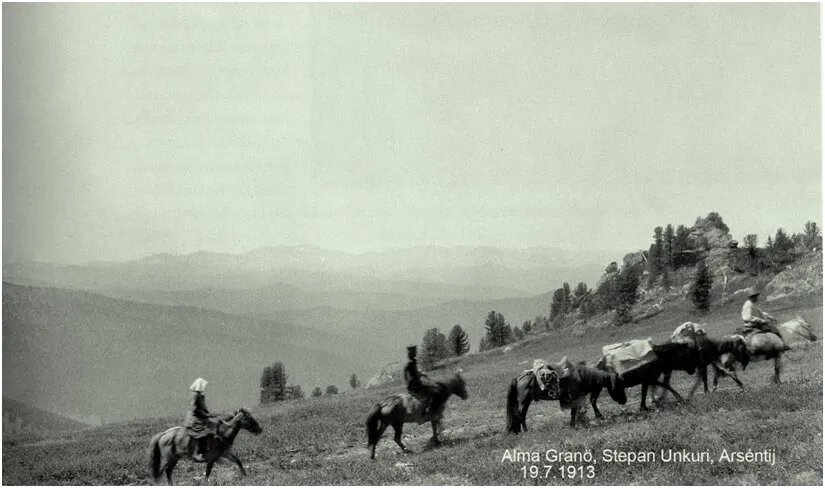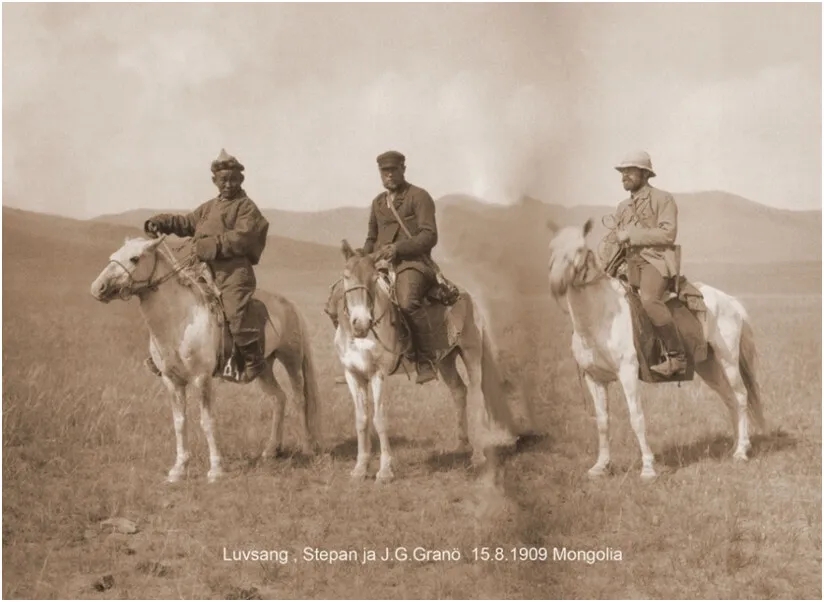 Всадники в монгольской степи в 1909 году. Проводник-монгол, учёный-путешественник Гране и его друг и помощник Степан Ункури, сын финна Матти, сосланного в Сибирь на пожизненное поселение. Степана Ункури расстрелял Сталин в 1938 году.