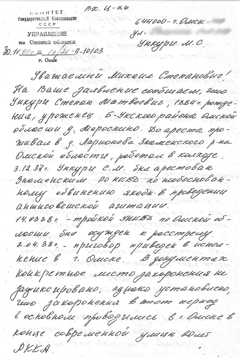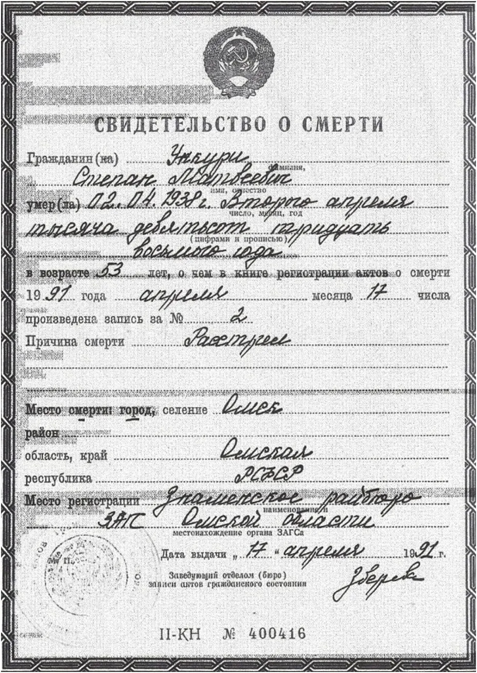В 1991 году Знаменский районный ЗАГС выдал нам свидетельство о смерти Степана Матвеевича Ункури, где причиной её указан расстрел, а местом – город Омск.