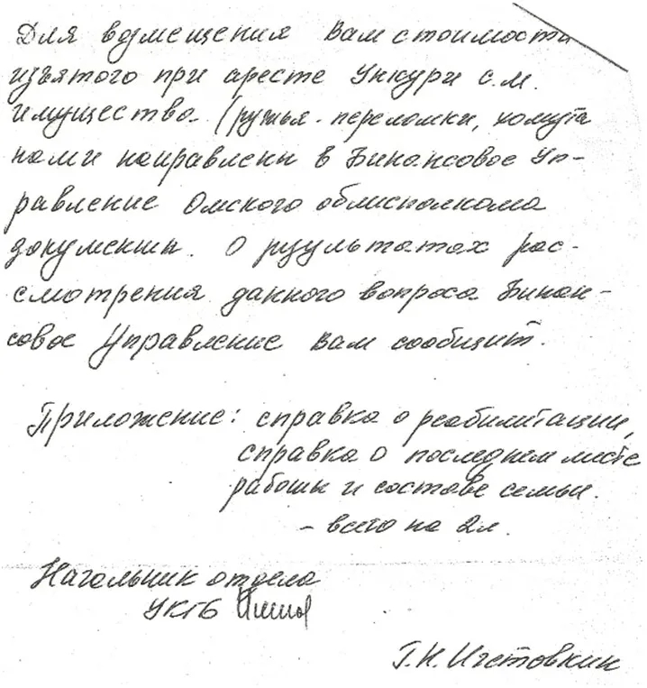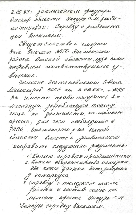 Василий Степанович Ункури умер в 1982 году. Что произошло с отцом, он так и не узнал, как не узнал и того, что они оба были реабилитированы 7 июня 1989 года. А вскоре после этого, в 1990 году, его брат, мой отец Михаил Степанович, получил ответ на свой запрос из Омского архива ФСБ о судьбе их отца Степана Матвеевича Ункури…