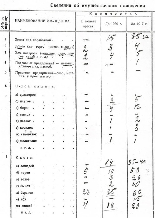 В справке, представленной председателем Финского сельсовета Янусом в Знаменский районный отдел НКВД (она есть в следственном деле Ункури), хорошо видно, какое хозяйство было у Степана Матвеевича в разные периоды жизни. О том, как оно постепенно сокращалось в годы репрессий и насильственно отбиралось советской властью, говорят цифры…